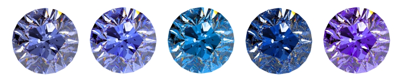 Der Tansanit zeichnet sich durch Pleochroismus aus: von verschiedenen Seiten betrachtet hat er stets eine etwas andere Farbe, von Blau bis Violett