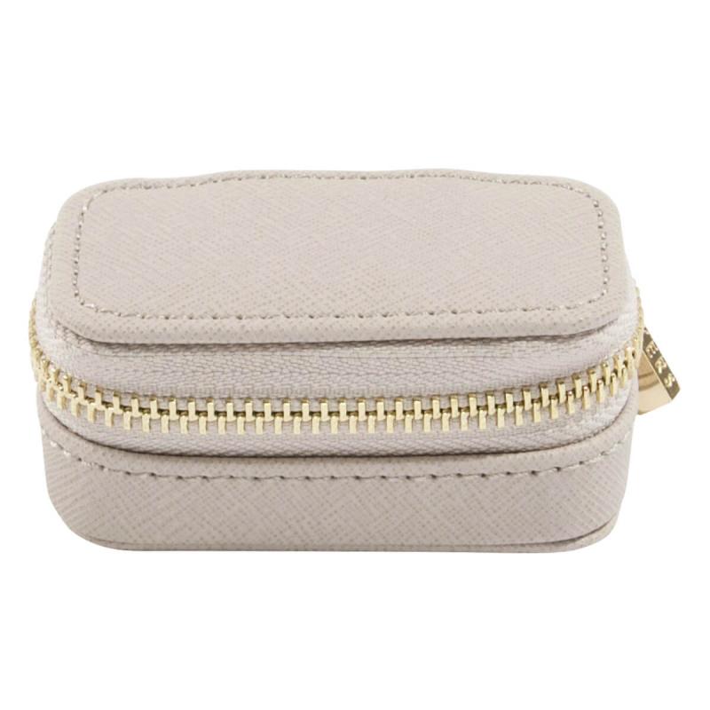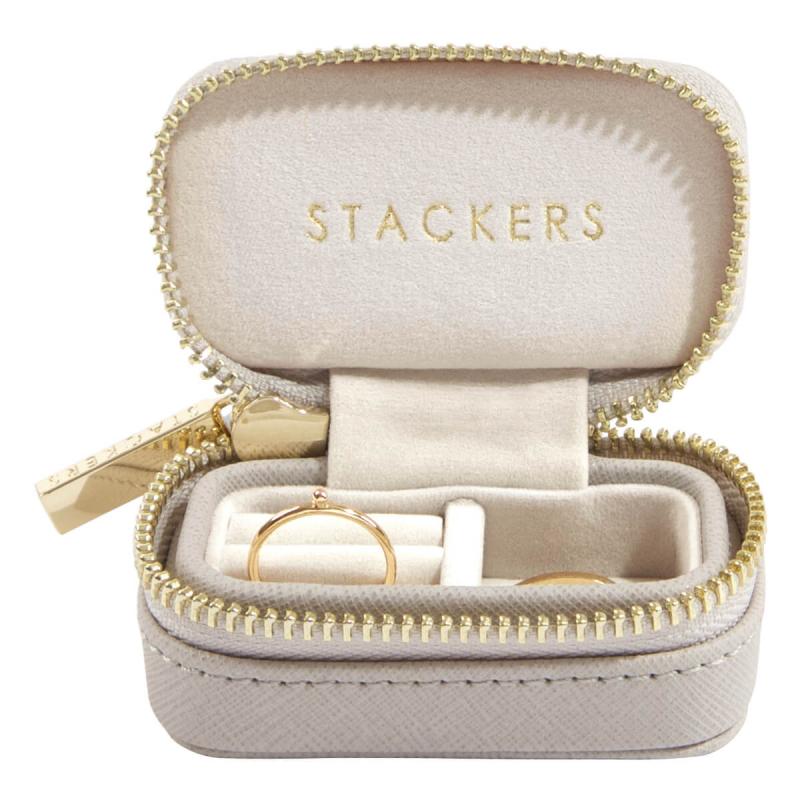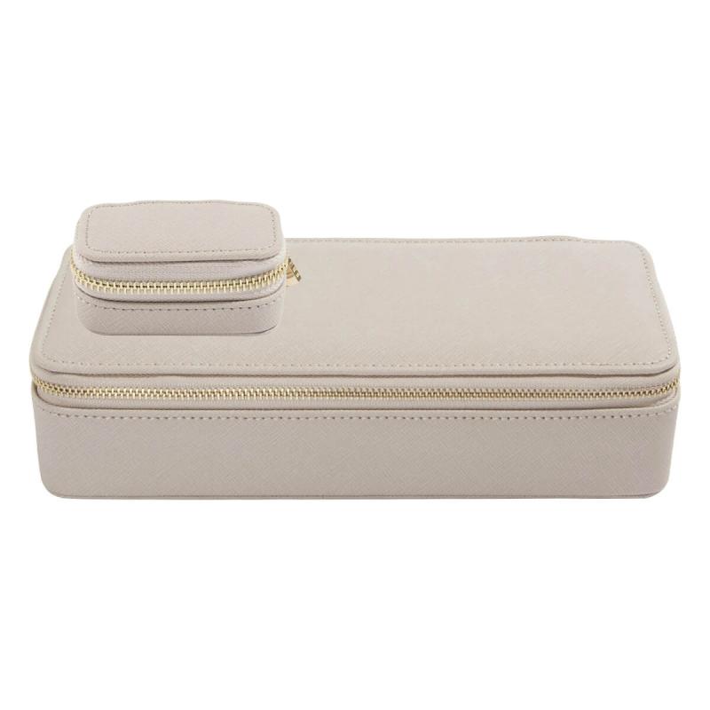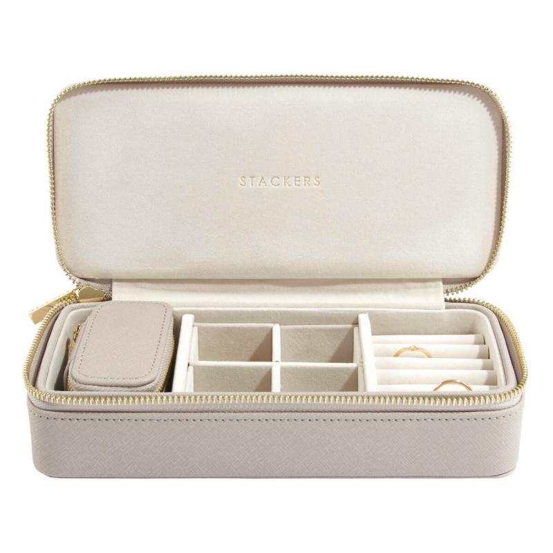 • große Reise-Schmuckschatulle 2 in 1 der Firma Stackers in graubeigem Kunstleder und innen mit grauem Samt und goldfarbenem Reißverschluss