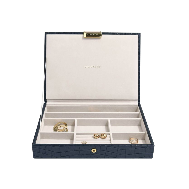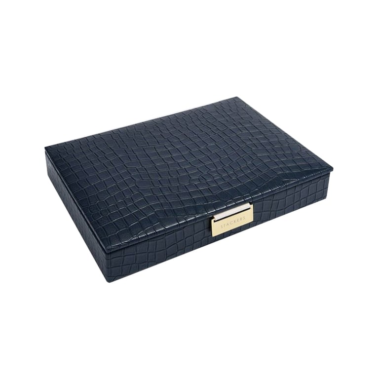 • große Schmuckschatulle der Firma Stackers in dunkelblauem veganem Leder und innen mit grauem Samt und goldfarbenem Metalldetails