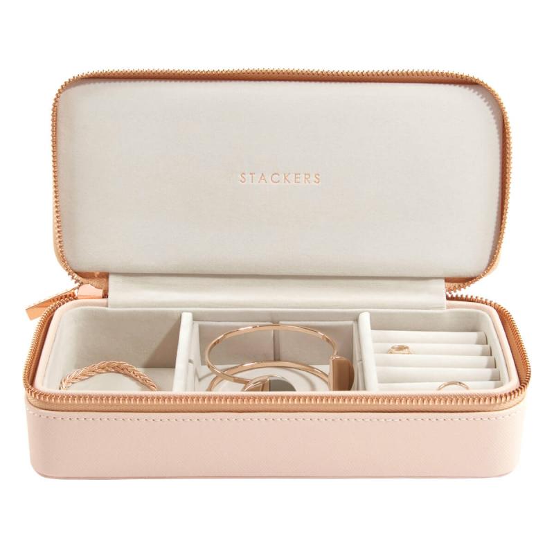 • große Schmuckschatulle der Firma Stackers in Kunstleder in Altrosa und innen mit hellem Samt und mit Metallteilen in der Farbe von Roségold