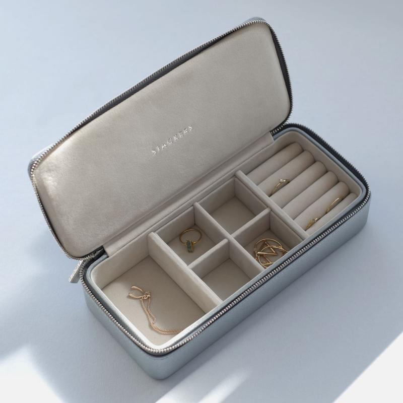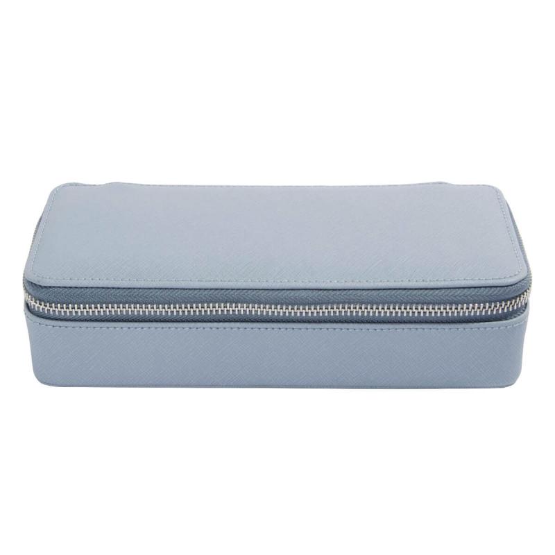 • große Reise-Schmuckschatulle der Firma Stackers in blauem Kunstleder und innen mit grauem Samt und silberfarbenem Reißverschluss
