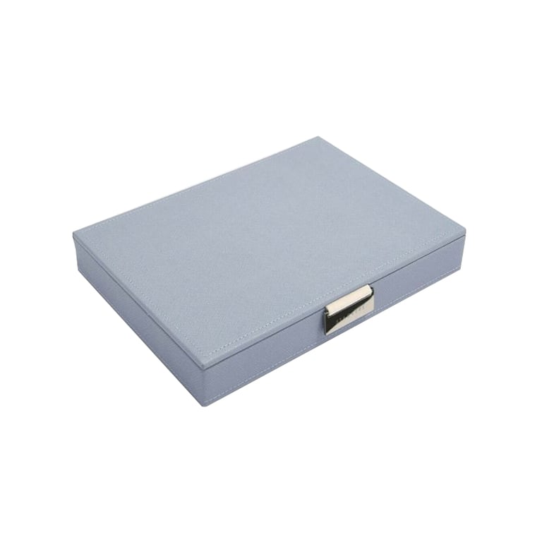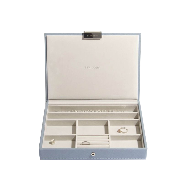 • große Schmuckschatulle der Firma Stackers in blauem veganem Leder und innen mit grauem Samt und silberfarbenem Metallteilen