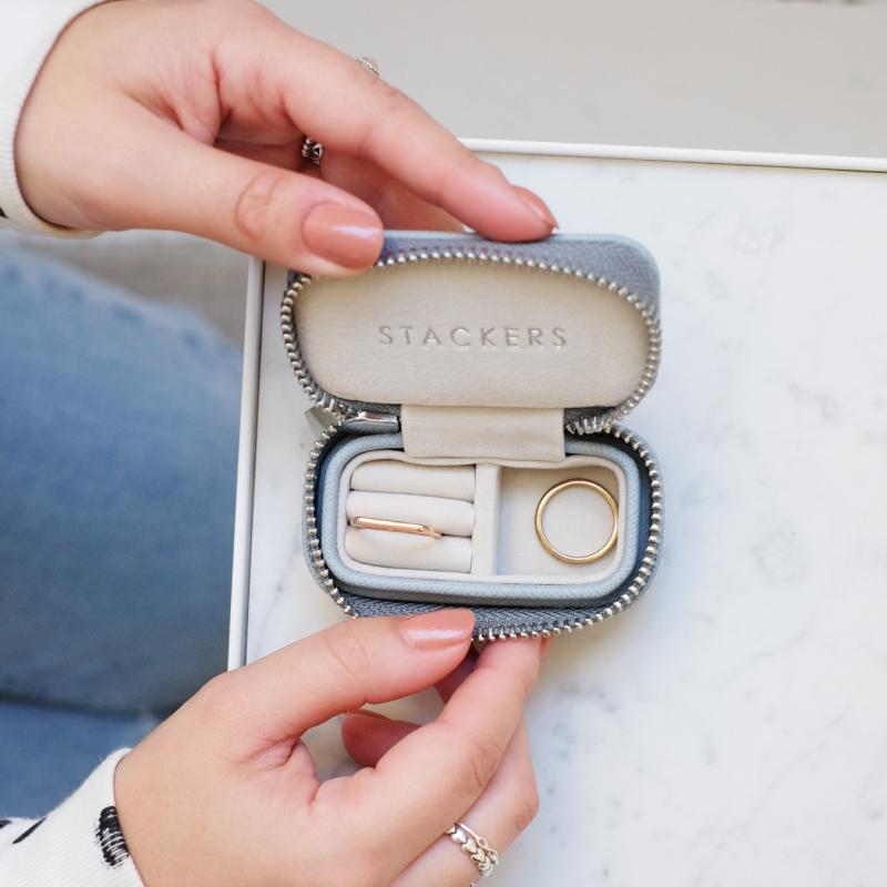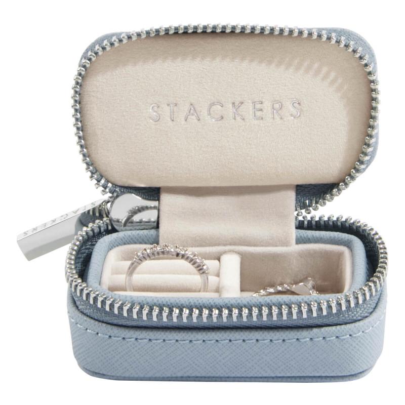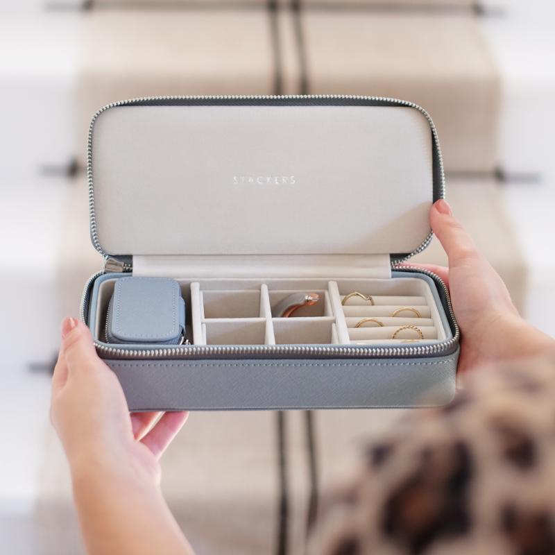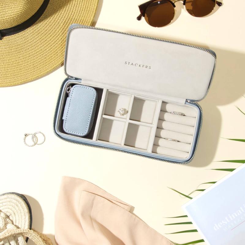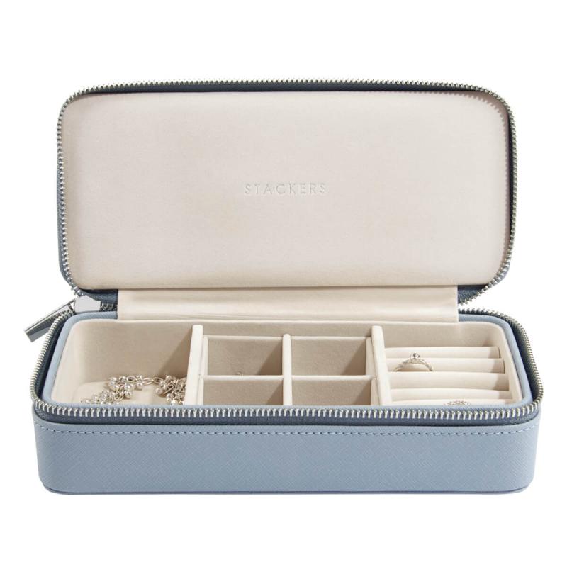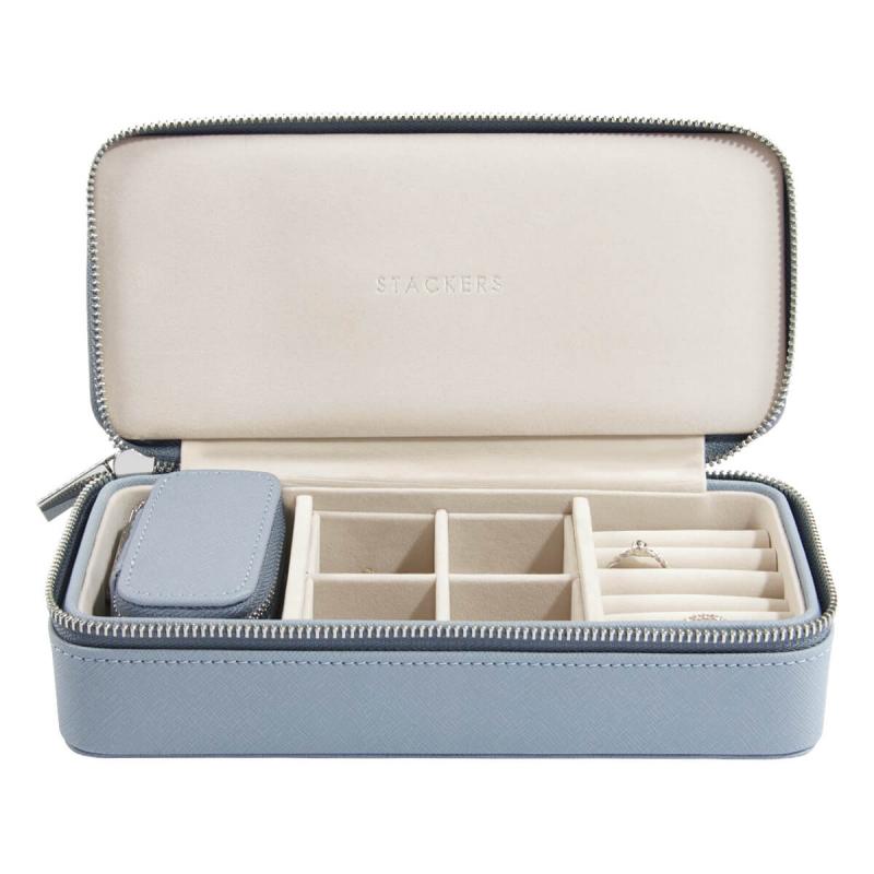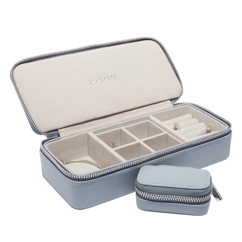 • große Reise-Schmuckschatulle 2in1 der Firma Stackers in blauem Kunstleder und innen mit grauem Samt und silberfarbenem Reißverschluss
