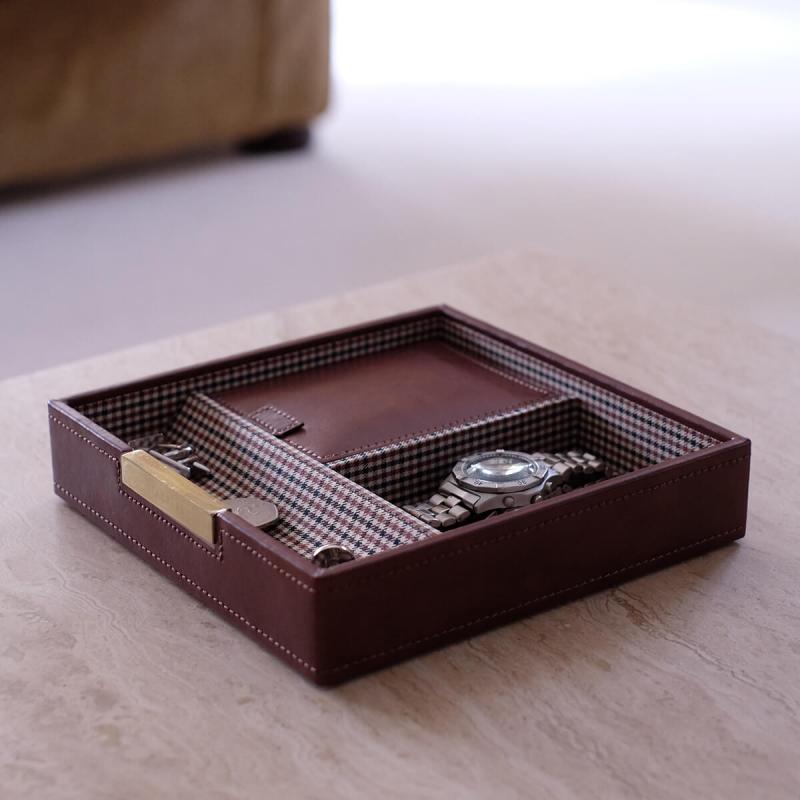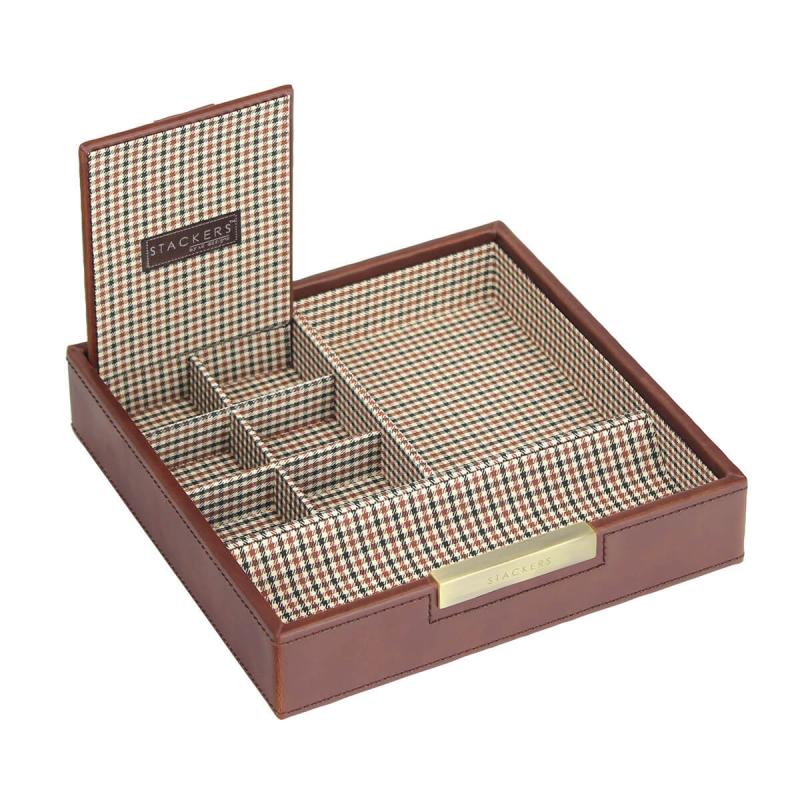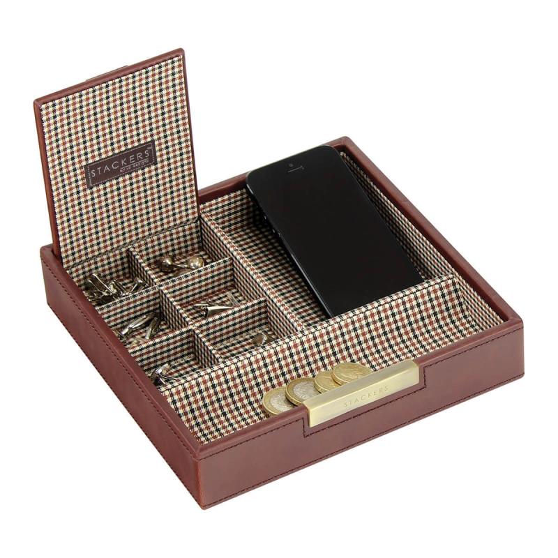 Die Stackers Aufbewahrungsbox ist eine elegante Lösung zur Aufbewahrung von Herrenschmuck und Accessoires. Die braune Kunstlederoberfläche wird durch eine Baumwollinnenseite mit Karomuster ergänzt. Das Etui ist ideal zum Aufbewahren von Uhren, Ringen, Manschettenknöpfen oder Handys. Halten Sie Ihr Zubehör organisiert.