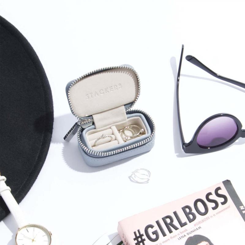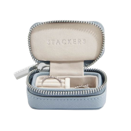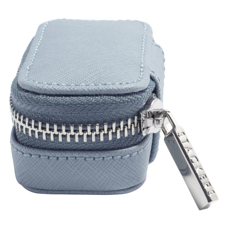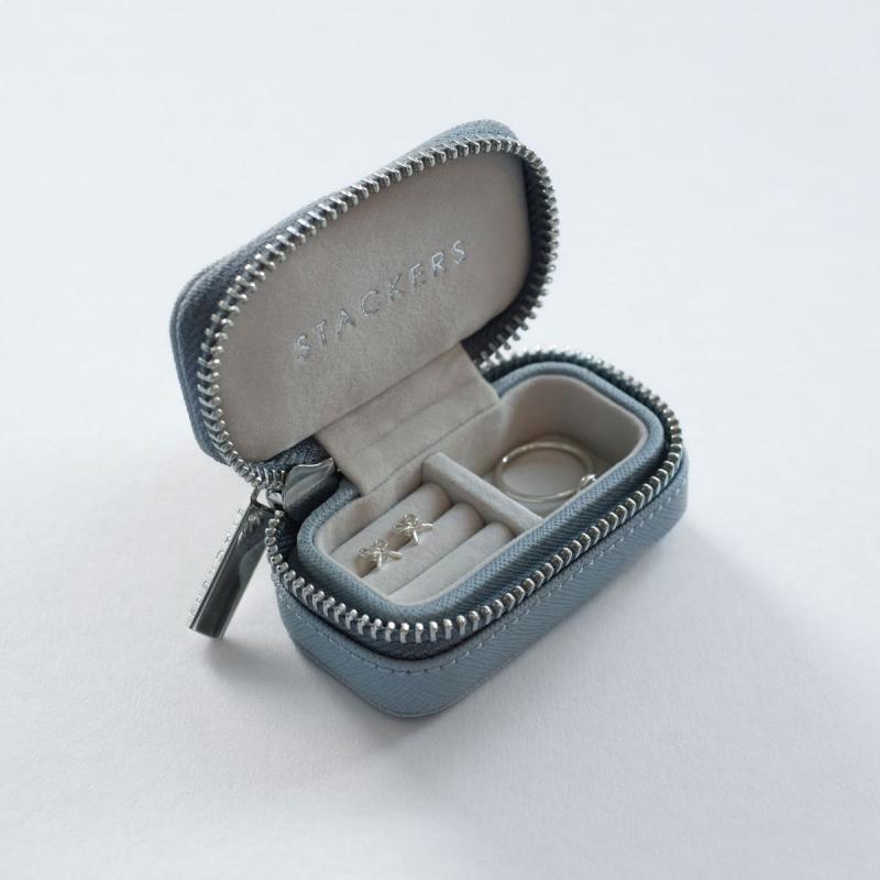 • kleine Reiseschmuckschatulle der Marke Stackers aus blauem Kunstleder und mit Reißverschluss