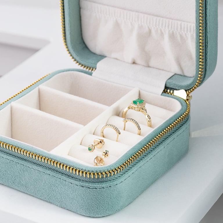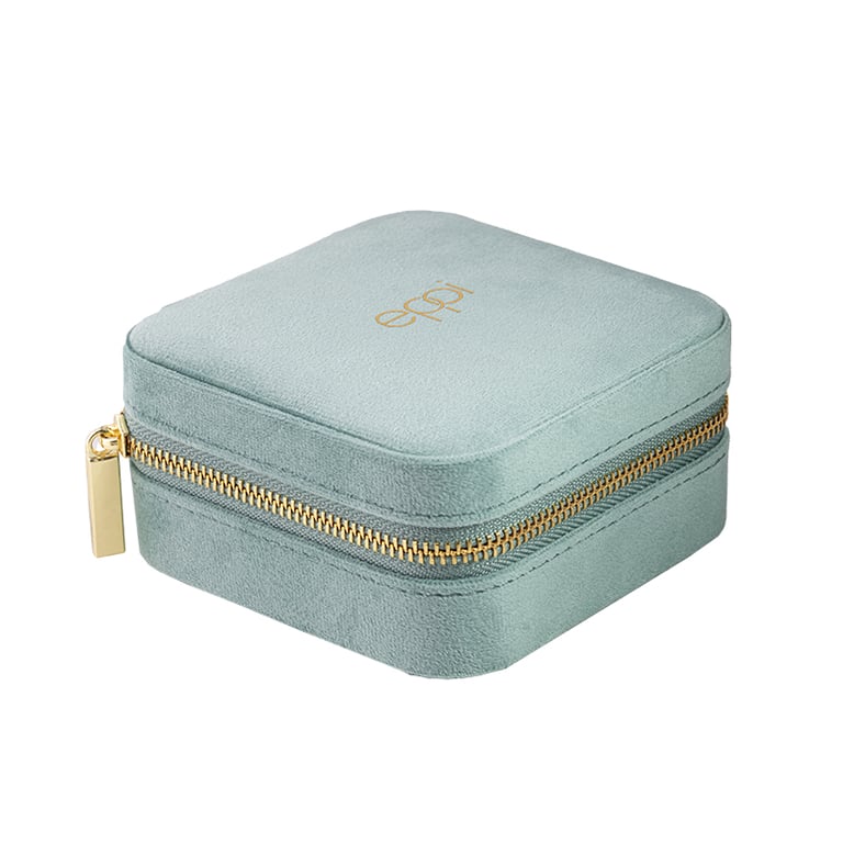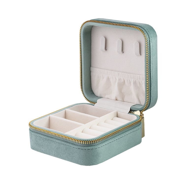 • praktische quadratische Schmuckschatulle in pastellgrün-blauer Farbe