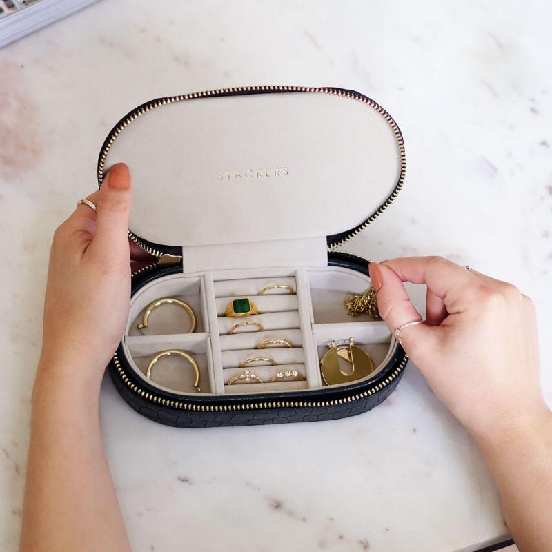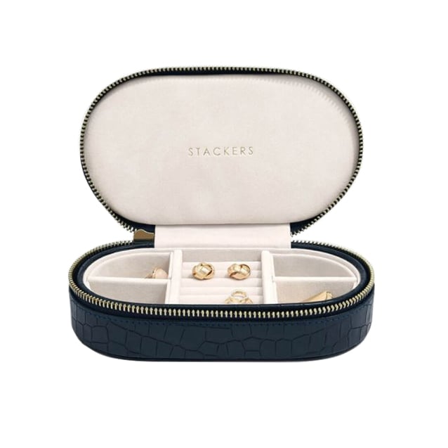 • ovale Reise-Schmuckschatulle der Firma Stackers in dunkelblauem veganem Leder und innen mit weißem Samt