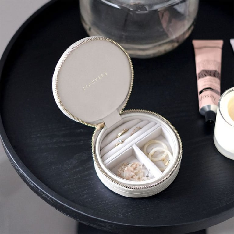 • runde Schmuckschatulle der Marke Stackers in Weiß mit Reißverschluss