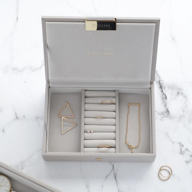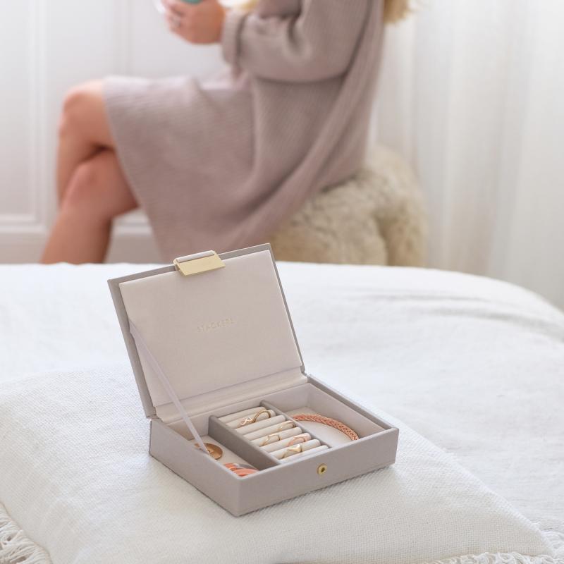 • Schmuckkästchen der Marke Stackers aus graubeigem Kunstleder mit goldfarbenen Details