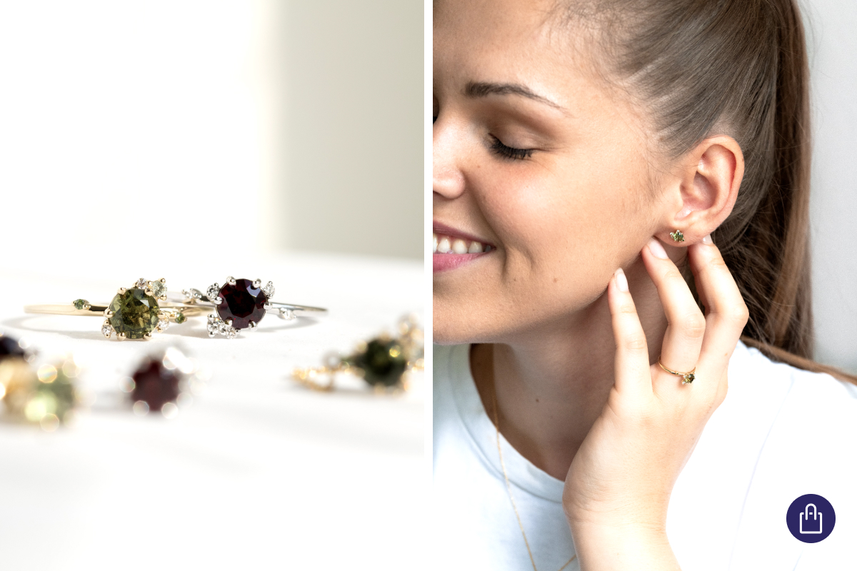 - Sowohl Granate als auch Moldavite kommen in Kombination mit sanften, neutralen Farben wie Beige, Graubraun, Creme, Schwarz oder klassischem Weiß perfekt zur Geltung.