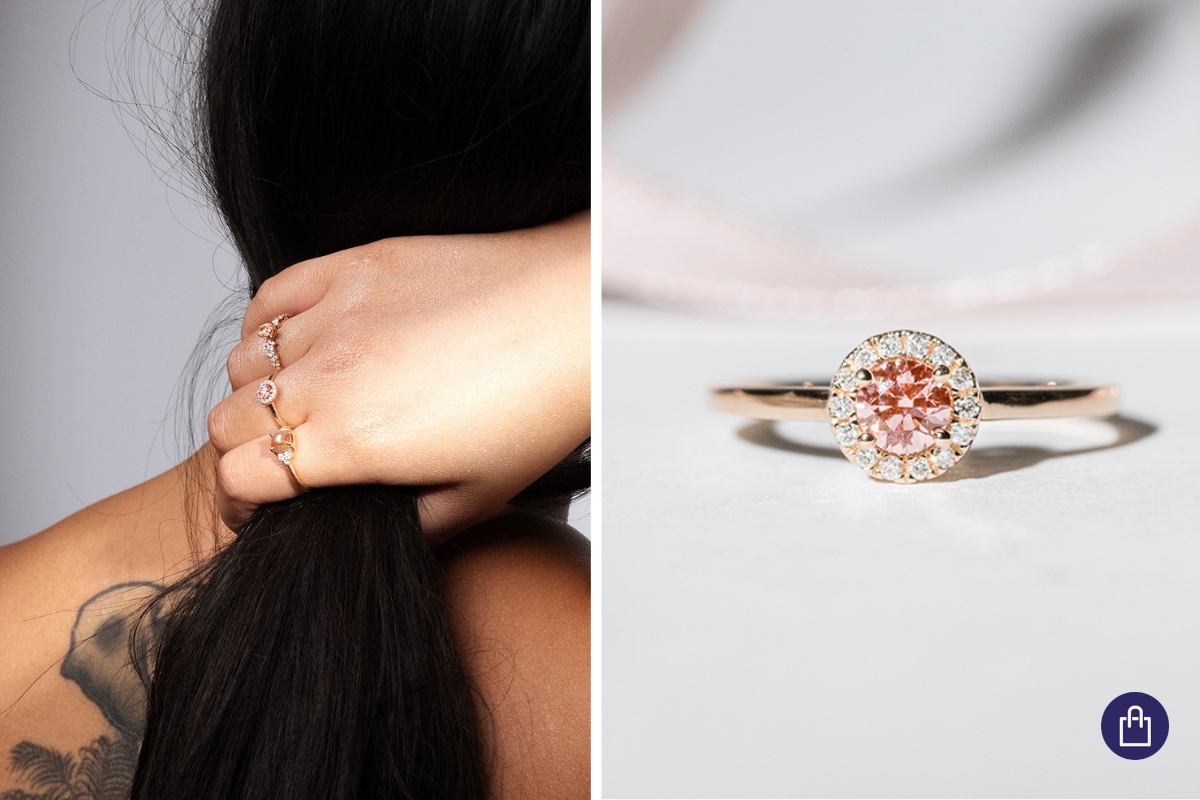 - Peach Fuzz lässt sich wunderbar mit weißen Diamanten kombinieren, da sie sein Funkeln wunderbar verstärken. Ein perfektes Beispiel dafür sind Verlobungsringe mit Morganiten, fancy pink- oder pfirsichfarbenen Lab Grown-Diamanten, deren seitliche Steine einfache weiße Diamanten in natürlicher oder im Labor hergestellter Form sind.