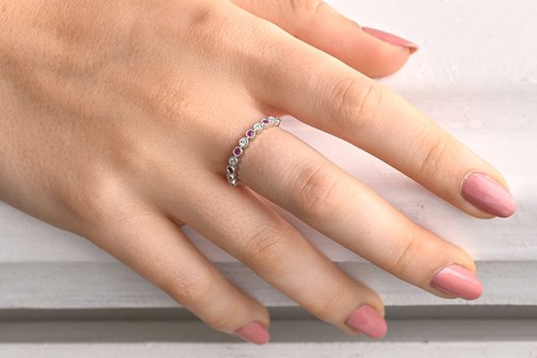 Kleiden Sie die Brautjungfern in magentafarbene Gewänder, den Herren empfehlen Sie eine passende Krawatte und lassen Sie karmesinrote Rosen oder Pfingstrosen in die Hochzeitssträuße binden. Und wenn Sie ein wirklich detailversessener Mensch sind, der alles bis ins Kleinste aufeinander abgestimmt haben möchte, sollten Sie Eheringe mit einem Hauch von Viva Magenta in Betracht ziehen. Zum Beispiel einen Eternity-Ring mit Diamanten und Rubinen oder ein Modell mit einem Rubinherzen.
