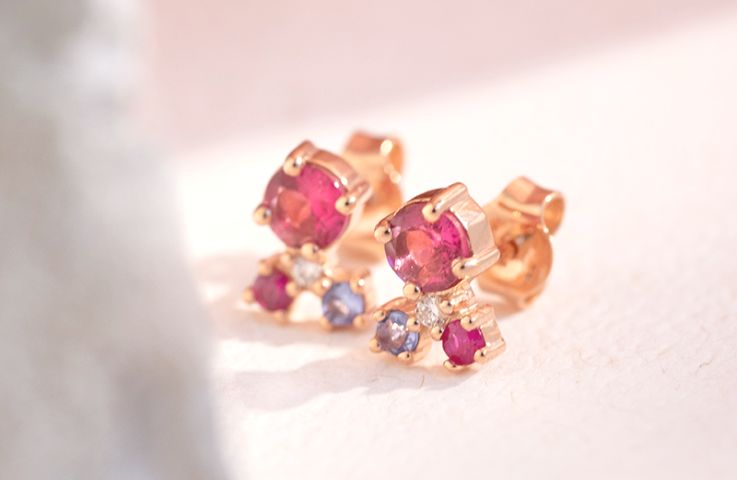 Auch Liebhaber des monochromen Stils können sich freuen. Edelsteine im Farbton Viva Magenta sehen auch in Kombination mit gleich- oder ähnlichfarbigen Edelsteinen absolut umwerfend aus. Scheuen Sie sich also nicht, Rot mit violetten und rosa Edelsteinen zu kombinieren. Ein Beispiel für eine solche Kombination sind die einzigartigen Cluster-Ohrringe, die mit einem roten Rubin, einem rosa Turmalin, einem violetten Tansanit und einem funkelnden Diamanten verziert sind.