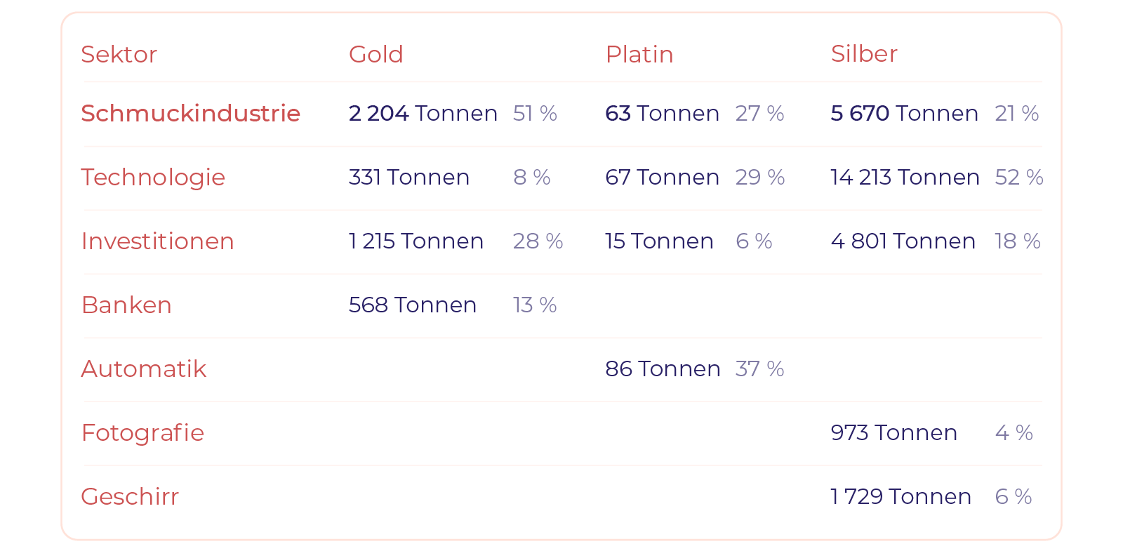 Die recycelten Metalle werden in verschiedene Wirtschaftszweige geliefert. In der Tabelle können Sie sich eine bessere Vorstellung davon machen, welche Menge in die Schmuckindustrie geliefert wird.