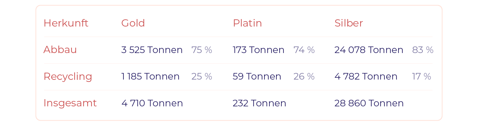 Die nachfolgende Tabelle reflektiert die Unterschiede der prozentualen Menge zwischen abgebautem und recyceltem Gold, Silber und Platin in den Jahren 2018–2019.