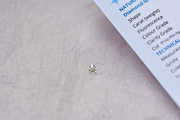 | Karatgewicht | Die Menge wird mit kalibrierten Edelsteinwaagen gemessen und bis auf fünf Nachkommastellen aufgezeichnet. Es folgen weitere Messungen des Diamanten und eine Beschreibung der Fluoreszenz. |