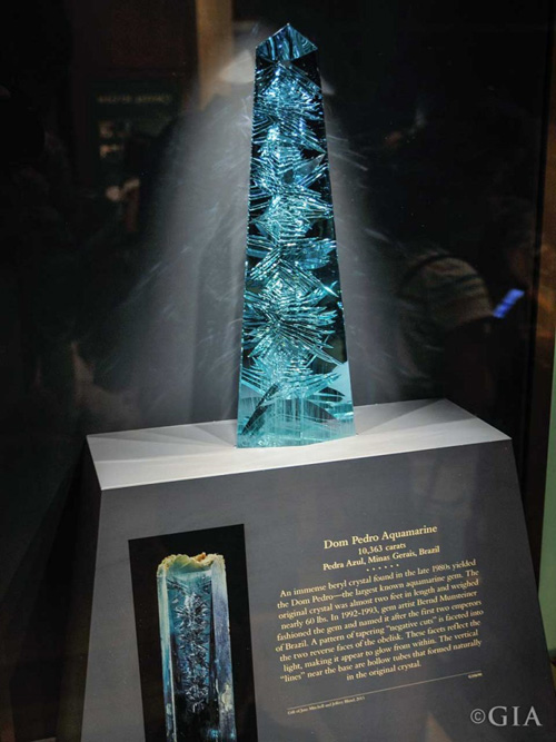 Dieser entzückende Aquamarin ist einer der größten, im Stück geschliffenen Edelsteine der Welt. Er wurde in den 80er Jahren des vergangenen Jahrhunderts in Brasilien entdeckt und nach einem brasilianischen Kaiser benannt. In seiner ursprünglichen ungeschliffenen Form wog er 45 kg und hatte eine Länge von fast 0,91 Metern. Dieser grünblaue Aquamarin wurde zu einem Obelisken geschliffen mit dem unglaublichen Gewicht von 10.363 kt und seine finalen Ausmaße betragen 36 cm in der Länge und 10 cm in der Breite. Der Obelisk wurde dem Smithsonian Institut geschenkt.