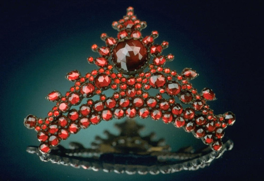 Dieser einzigartige Schmuck stammt aus der viktorianischen Zeit und wurde aus Pyrop-Granaten hergestellt, die in Böhmen gefunden wurden. Die Granaten sind im Rosen-Schliff geschliffen, der in der Viktorianischen Zeit sehr beliebt war. Die Haarspange wurde von den Eheleuten Hrdlička im Jahr 1937 dem Smithsonian Institut geschenkt.
