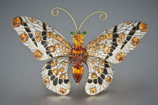 Dieses bezaubernde Juwel in Schmetterlingform besteht aus weißen Diamanten und zwei Granatsorten – orangefarbenen Spessartinen und grünen Tsavoriten. Die orangefarbenen Granate stammen aus der Little Tree Mine in Kalifornien und die grünen Granaten wurden in Kenia abgebaut. Die schmetterlingsförmige Brosche ist im National History Museum in Los Angeles ausgestellt.