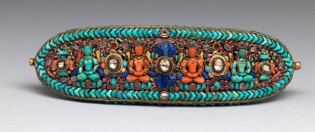 Der Stirnschmuck für die Götter stammt aus dem Nepal des 17.–19 Jahrhunderts . Er zeigt die vier himmlischen Tathagata-Buddhas, die auf das Reine Land zeigen. Die Seite des Vairocana Buddha symbolisiert die Doppelspitze eines rituellen Vajra. Der große Diamant auf seiner Achse verweist auf Vajrayana, den unzerstörbaren Pfad. Die Dekoration besteht aus Gold, Korallen, Diamanten, Rubinen, Smaragden, Saphiren, Granaten, Lapislazuli, Perlmutt und Türkis. Sie können den Schmuck im Metropolitan Museum of Art in New York bewundern.