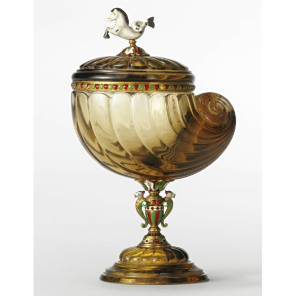 Die Fabergé-Werkstatt schnitzte aus Rauchquarz eine muschelförmige Schale mit aufklappbarem Deckel, die mit einem weiß emaillierten Meeresfabelwesen verziert ist. Der goldene Stiel wird durch Emaille-Details in Apfelgrün und Erdbeerrot ergänzt. Der Autor des Kunstwerks ist laut Initialen auf dem Sockel der berühmte Mikhail Perchin, die Schale stammt aus der Zeit um 1900.
