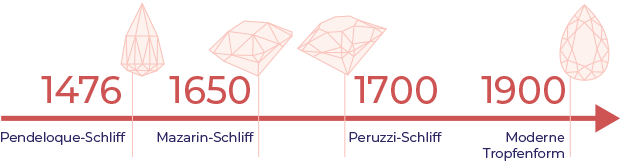 Die Geschichte der Tropfenform reicht bis ins 15. Jahrhundert zurück und ist eng mit der Entwicklung der Diamantschleifkunst verbunden. Der erste tropfenförmige Diamant wurde vom flämischen Schleifer Lodewyk van Bercken aus Brügge geschaffen. Van Bercken erfand die Polierscheibe (Scaif), die es erstmals ermöglichte, Diamanten facettiert und symmetrisch zu schleifen. Diese Erfindung revolutionierte die Schmuckwelt und machte es möglich, das Licht in bisher unerreichter Weise im Diamanten zu reflektieren. Mit dieser Technik setzte sich die Tropfenform als modische Neuheit durch und erhielt Namen wie „Pendeloque“ oder „Briolette“. Diese Form fand schnell Anklang bei Adligen und Königen, die sie in prunkvollen Ohrringen und Anhängern trugen.