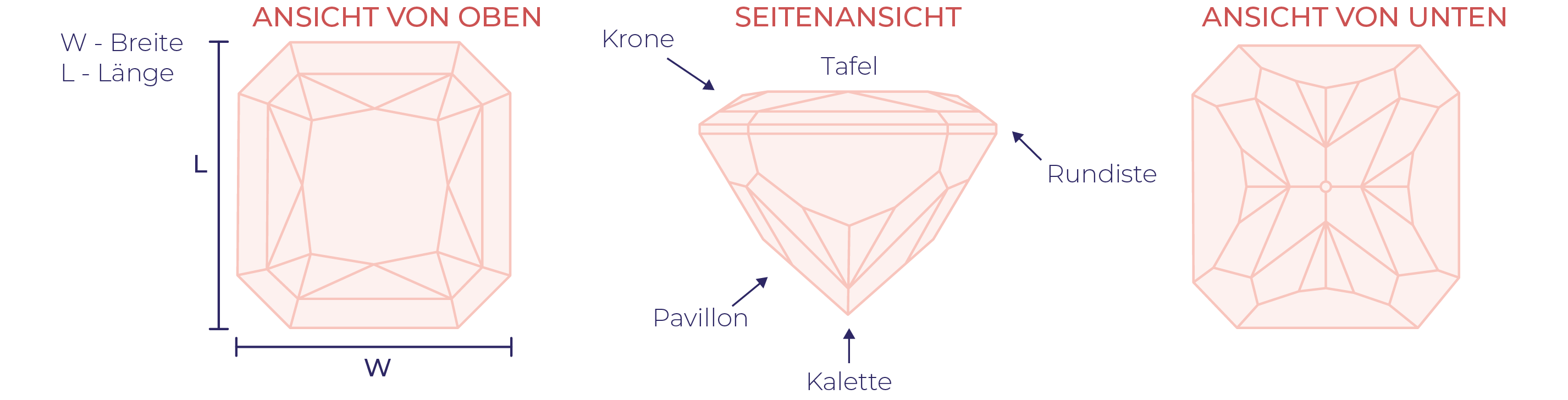 Aufgrund der großen Anzahl von Facetten hat diese Form die höchste Brillanz unter den quadratischen und rechteckigen Formen. Im Vergleich zu anderen Formen kann sie auch kleine Einschlüsse besser verbergen. Es handelt sich um einen hybriden Schliff, der die Merkmale von Brillant- und Treppenschliff vereint. Damit ist dieser Schliff die perfekte Lösung für diejenigen, die von allem etwas haben wollen.