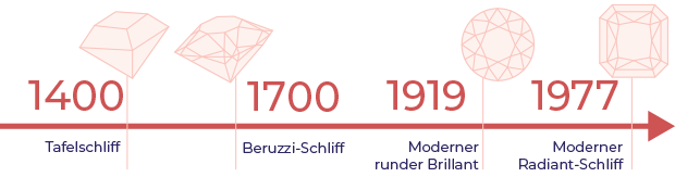 Die Entwicklung des Radiant-Schliffs stellt einen wichtigen Meilenstein in der Geschichte der Diamantbearbeitung dar. 1977 schuf der Diamantschleifer Henry Grossbard von der Radiant Cut Diamond Company den ersten Radiant-Schliff. Bis zu diesem Zeitpunkt waren quadratische und rechteckige Diamanten, insbesondere solche im Treppenschliff, in ihrer Brillanz eingeschränkt und reflektierten weniger Licht als runde Brillantschliffe. Grossbard gelang es jedoch, eine innovative Hybridform zu schaffen, die die optischen Vorzüge beider Welten vereint. Der Radiant-Schliff kombiniert die Struktur des Treppenschliffs mit dem funkelnden „Feuer“ der Facettenanordnung eines Brillanten.