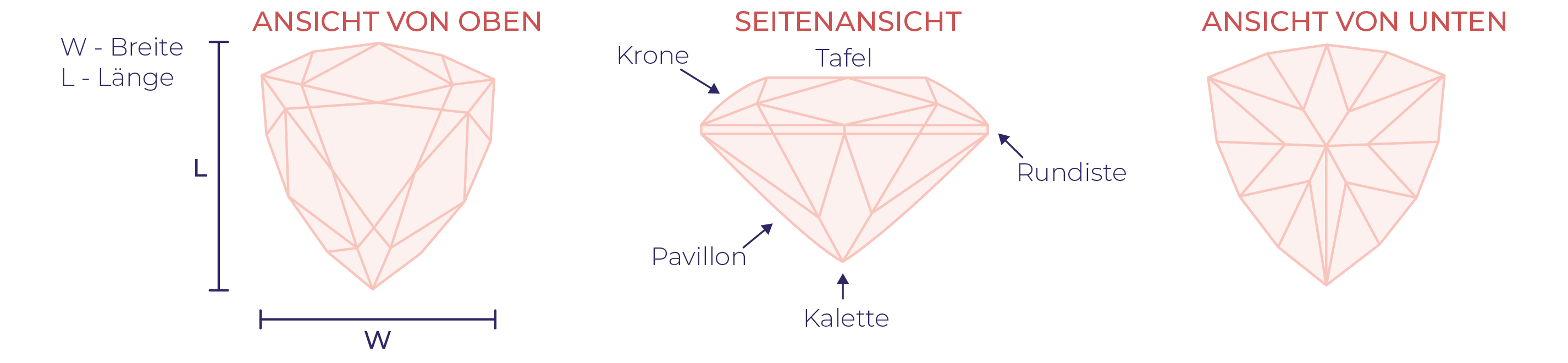 Dreieckige Formen eignen sich hervorragend als Begleit- und Nebensteine, bieten aber auch die Möglichkeit eines brillanten und einzigartigen Solitärs. Die Tiefe ist bei dieser Form ein wichtiger Faktor, vor allem wenn es sich um Solitäre handelt, da sie die Leuchtkraft und die Brillanz des Steins stark beeinflussen kann. Gut geschliffene Formen mit großer Leuchtkraft und Brillanz können Einschlüsse perfekt verbergen.