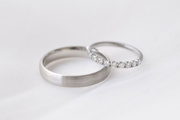 Das weiche Metall (Mohs-Skala: 2) besticht durch seine weiß-graue Farbe, die sich hervorragend mit anderem Schmuck und Outfits kombinieren lässt. Es ist ein relativ preiswertes Material, das Juweliere aufgrund seiner Eigenschaften gut verarbeiten können; es gehört jedoch nicht zu den gängigsten Metallen für Trauringe und Juweliere empfehlen, ein anderes edles Material mit höherer Haltbarkeit zu wählen. Bei der Auswahl von Eheringen aus Silber ist darauf zu achten, dass sie gepunzt sind (der Reinheitsgrad 925/1000 gilt traditionell als der beste). Vergewissern Sie sich, dass die von Ihnen ausgewählten Stücke rhodiniert sind, um die Oberfläche zu härten und das Schwarzwerden des Materials zu verhindern.