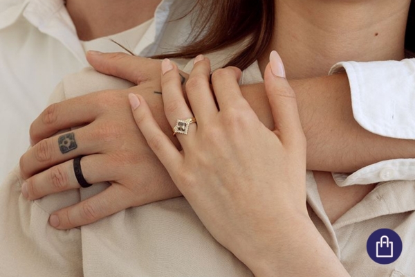 Heutzutage sehen wir das nicht mehr so eng und betrachten dies aus einem moderneren Blickwinkel. Der Ring des Bräutigams muss nicht unbedingt zum Ring der Braut passen. So oder so bevorzugen Männer schlichtere Designs und fühlen sich zu weniger romantischen Materialien hingezogen – Carbon zum Beispiel ist bei ihnen sehr beliebt. Scheuen Sie sich also nicht vor unkonventionellen Lösungen. Wenn die Braut ein verziertes goldenes Set und der Bräutigam einen einfachen schwarzen Carbonring wählt, können Sie sich ruhig für eine solche Kombination entscheiden.