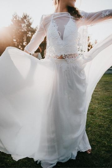 … zeigen sich 2025 verspielt und detailverliebt: Spitzen, Perlen, Schleifen und kunstvolle Stickereien mit Perlen oder dezenten Farbakzenten prägen das Bild. Besonders angesagt sind kurze Brautkleider, die die Figur der Braut stilvoll betonen. Ebenfalls im Trend: zweiteilige Brautkleider bestehend aus Top und Rock – ein Look, der nicht nur modern, sondern auch praktisch ist. Das Oberteil kann nach der Hochzeit ganz einfach mit einer Hose oder einem kürzeren Rock kombiniert werden. Damit sind Zweiteiler eine besonders nachhaltige Wahl für Ihre Garderobe, da sich die einzelnen Stücke vielseitig weitertragen lassen. Auch voluminöse, locker fallende Ärmel sind derzeit sehr beliebt und verleihen dem Brautkleid eine romantische Note. Ergänzen Sie das aufwendig gestaltete Kleid am besten mit dezentem Schmuck, der die raffinierten Details unterstreicht und gleichzeitig Ihren persönlichen Stil zur Geltung bringt.