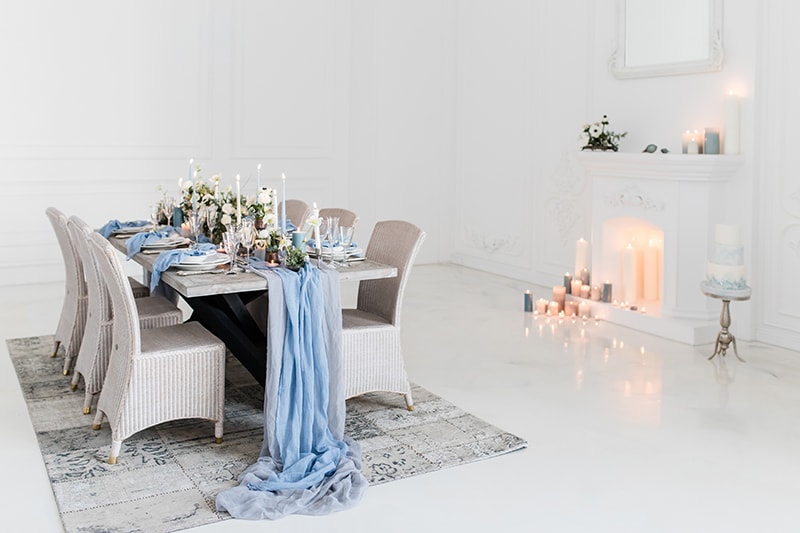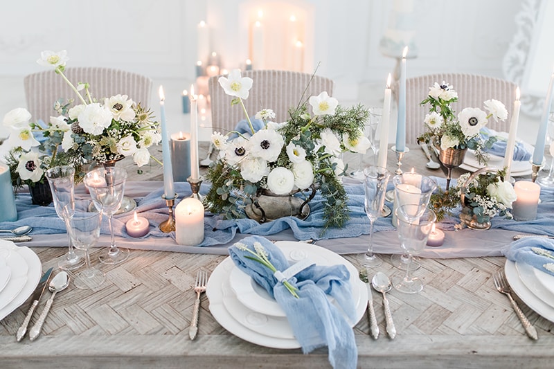 Diese hängt natürlich stark vom Thema ab, aber sollte gleichzeitig auch das winterliche mit aufnehmen. Natürliche oder Bohohochzeiten werden sich über alles freuen, was die Natur zu dieser Zeit anbietet wie rote Beeren, Nadelzweige, Zapfen oder klassische Mistelzweige. Diese passen perfekt entweder zu eleganten Dekorationen in kühleren Farben und Pastelltönen mit Kerzenständern, Kristall und Glitzer sowie Silber. Ebenso aber auch zu wärmeren und intensiven Tönen in Rot, Violett oder Grün mit Holz, Kamin und klassischen Winterdüften mit Nelken, Zimt, Äpfeln und Mandarinen.