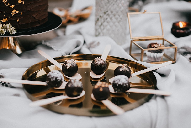 Bei der Wahl einer Hochzeitstorte sind der Fantasie keine Grenzen gesetzt und auch weniger beim Material. Falls Sie traditionelle Winteraromen lieben, kann auch die Hochzeitstorte nach Karamell, Zimt, Äpfeln und dunkler Schokolade schmecken. Die Naked Cakes, die immer noch sehr im Trend liegen, bieten sich als Hochzeitstorte geradezu an, da diese mit ihrem “unperfekten” Einstrich in weiß perfekt mit allen Winterfarben harmonieren wird. Aber auch weniger traditionelle Alternativen zu Torten passen im Winter perfekt. Wie wäre es mit einer Etagere voll mit Hochzeitskrapfen?