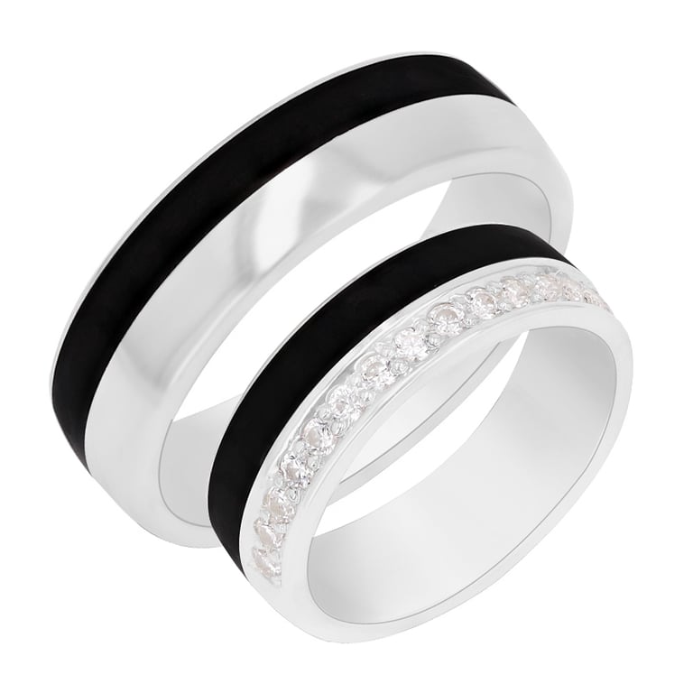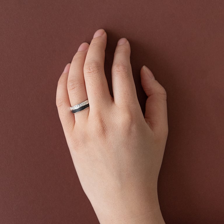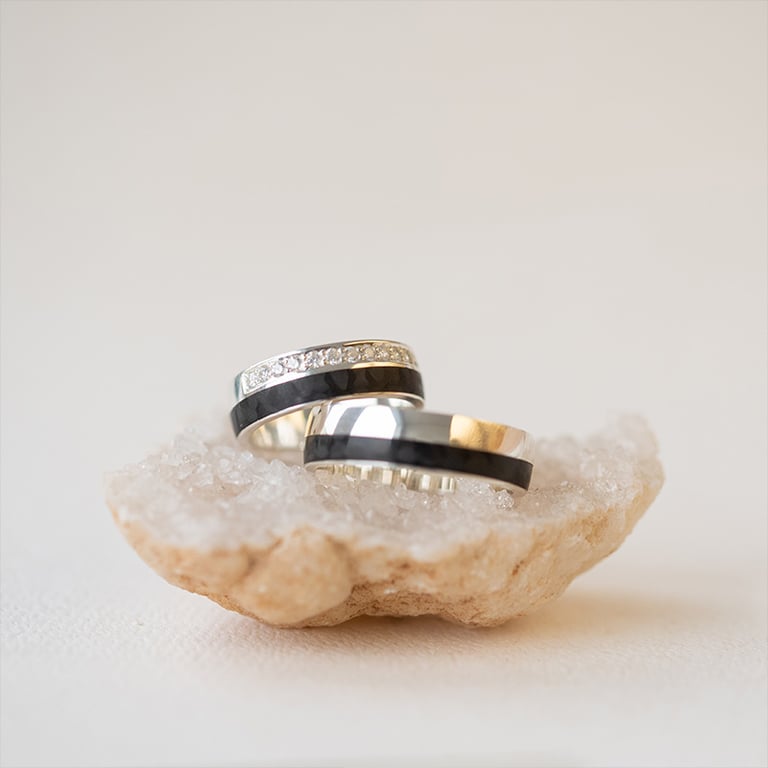 Abgerunde Trauringe aus Carbon und Gold mit Diamanten Cassia