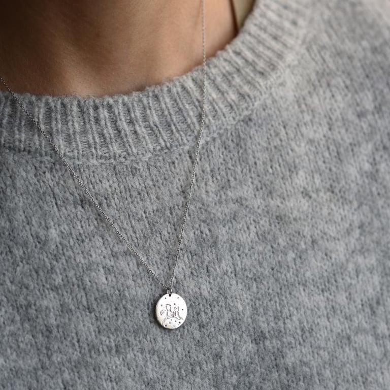 • ein zarter Anhänger verziert mit einer präzisen Gravur des Kleinen Prinzen und seiner Rose