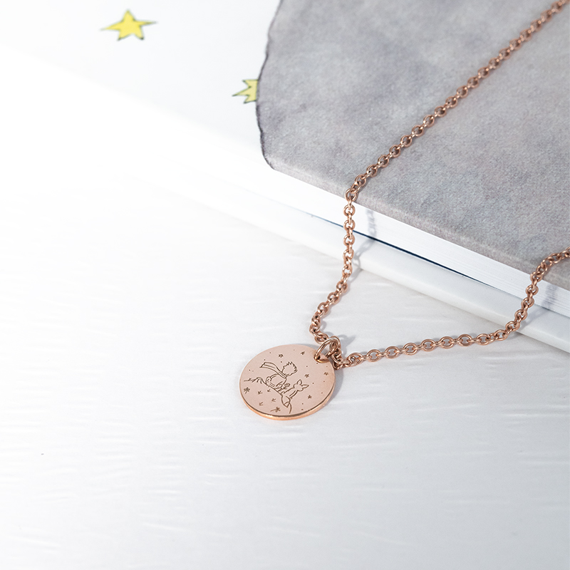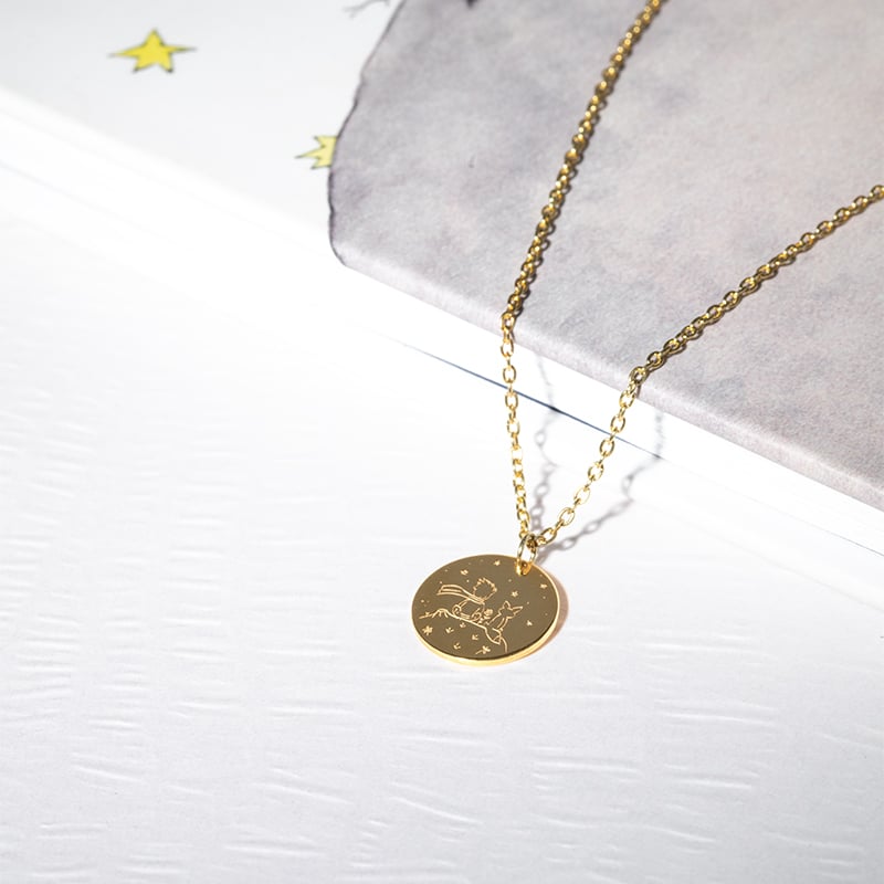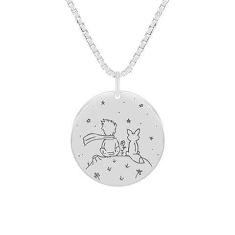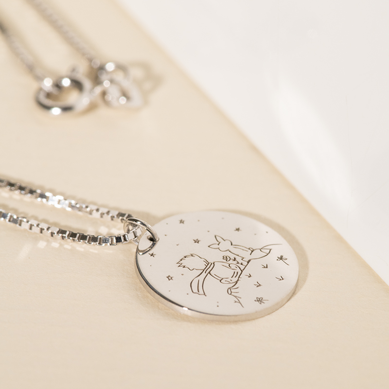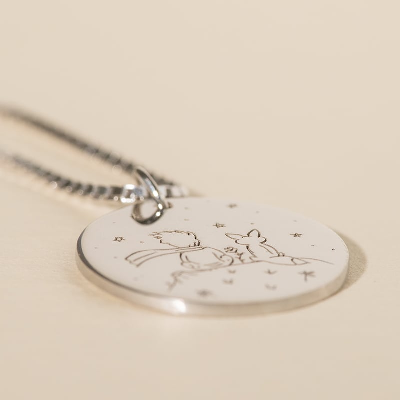 • ein zarter Anhänger, verziert mit einer präzisen Gravur des Kleinen Prinzen und des Fuchses
