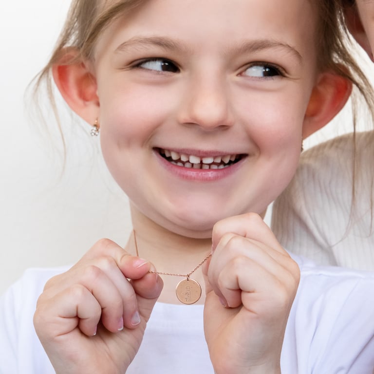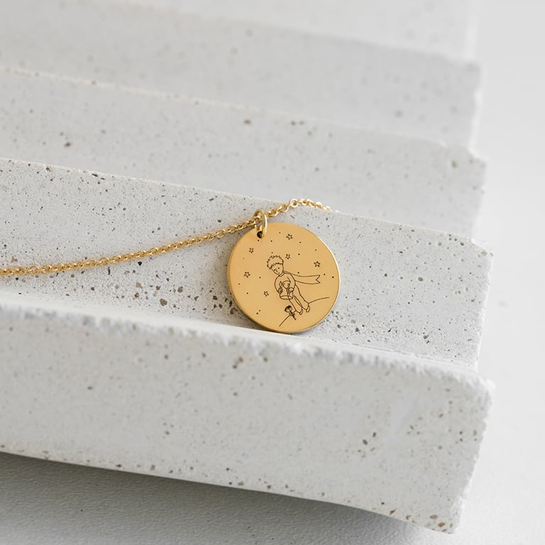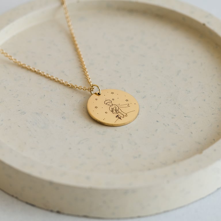 • ein zarter Anhänger verziert mit einer präzisen Gravur des Kleinen Prinzen und seiner Rose