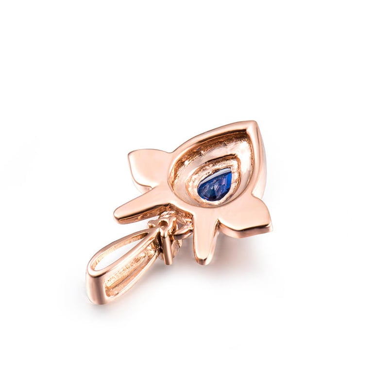 • der tränenförmige Saphir wird von einem Halo aus Diamanten umgeben, die in modischem Roségold gefasst sind