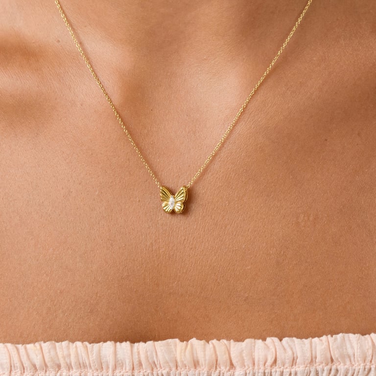 • der elegante goldene Anhänger in Form eines Schmetterlings, verziert mit natürlichen Diamanten, besticht durch seine Zartheit und sein Funkeln