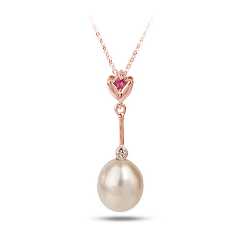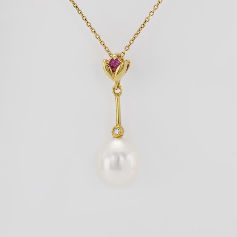 • ein wunderschöner, barock anmutender Schmuck mit einer ovalen, weißen, leicht rosa schimmernden Perle, die von einem Diamanten bekrönt wird, der wiederum an einer goldenen Blume hängt, in der ein rosa Saphir aufblitzt