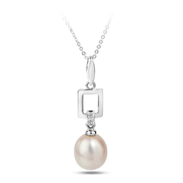 • eine weiße ovale Perle hängt an einer ausgeklügelten Aufhängung, die zwei Diamanten zieren