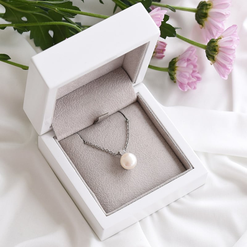 • eine weiße Perle und ein glänzender Zirkonia im silbernen Anhänger