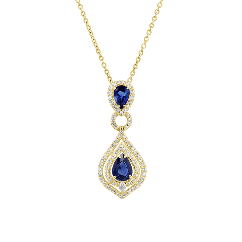 • bei diesem Goldanhänger werden Saphirtropfen von mehrfachen Diamanten umfasst