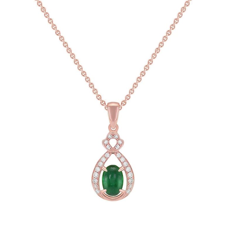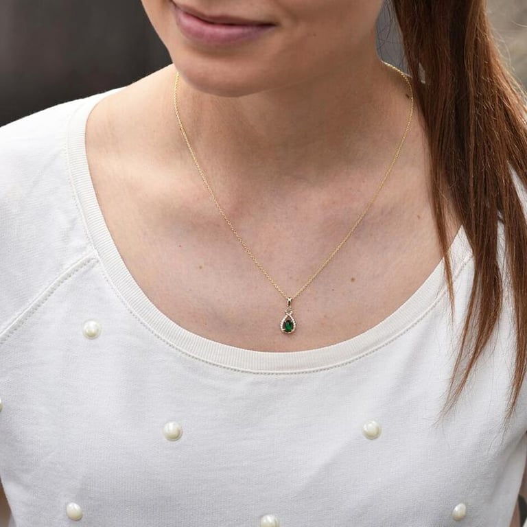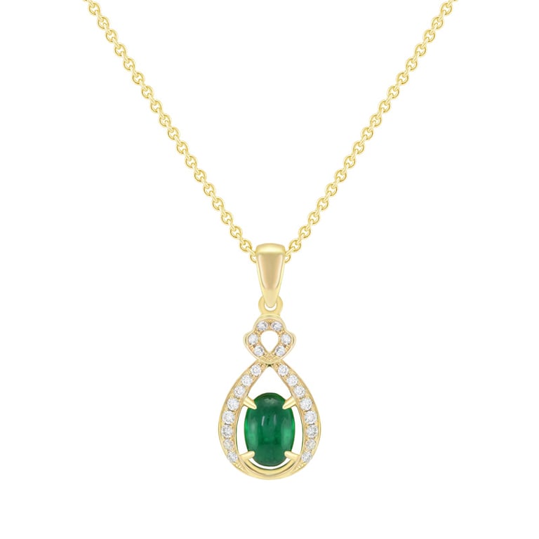 • goldene Anhänger mit einem ovalen grasgrünen Smaragd umgeben von einer diamantenbesetzten Fassung in Tropfenform