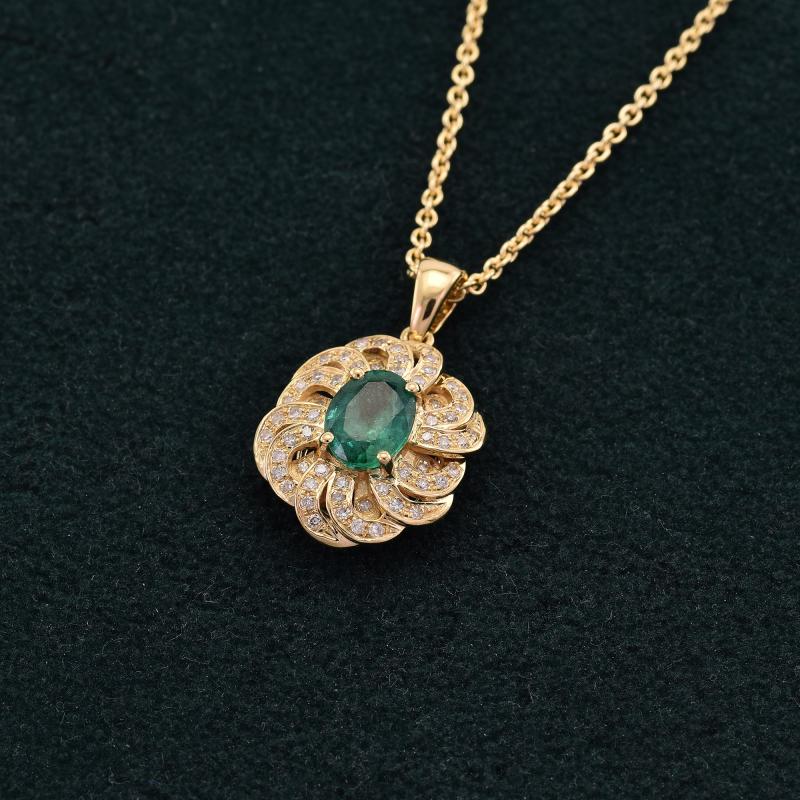 • ein großer froschgrüner Smaragd sitzt inmitten von goldenen, mit Diamanten übersäten Blütenblättern