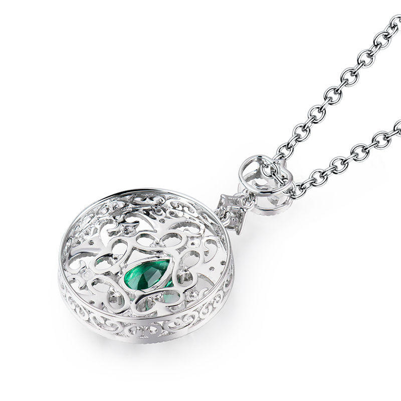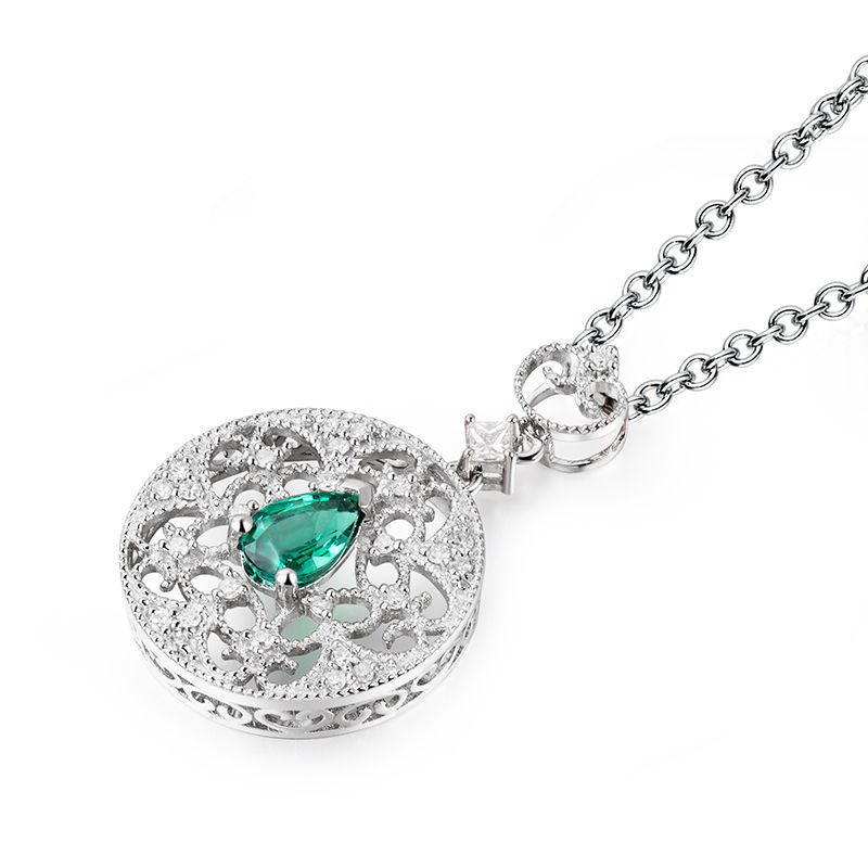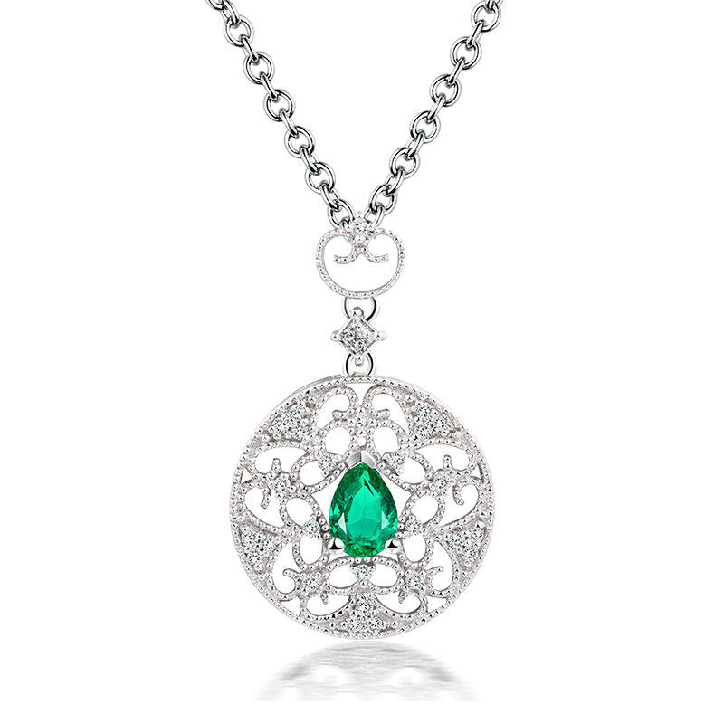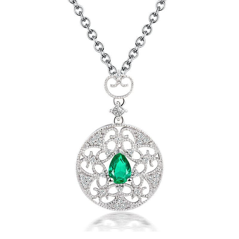 • ein tränenförmiger Smaragd ist in ein rundes Ornament mit Zierelementen eingebunden, das mit Diamanten besetzt ist