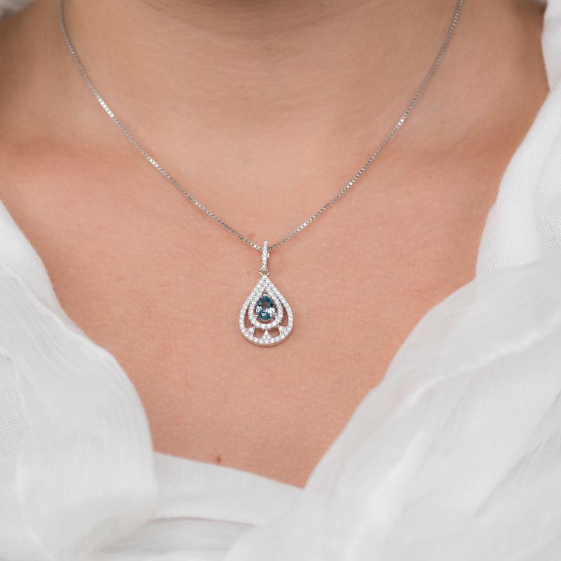 • der Topas in Tropfenform ist im speziellen Schweizerblau, das durch die Zirkonia mit kühlen Farbreflexen fasziniert