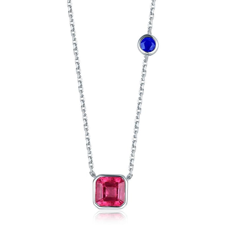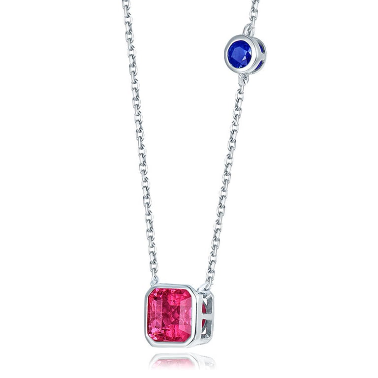 • der pinke Saphir im Princess Cut wird von einem runden Saphir in tiefem Blau begleitet