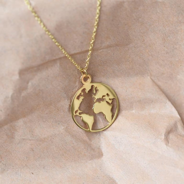 • tragen Sie unsere Halskette World in Form der Erde und goldener Weltkarte und lassen Sie Ihren Träumen freien lauf